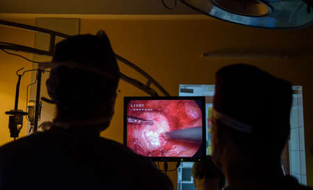 Surgeons using laparoscope during operation in pelvic area