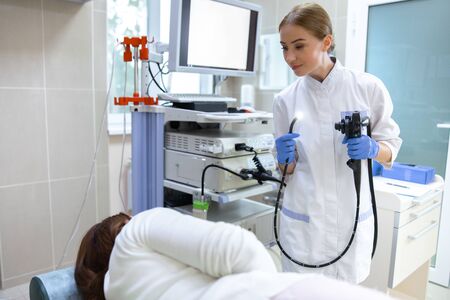 A female doctor holds an endoscope during a gastroscopy for a hospital patient. Medical office for diagnosing abdominal pain.