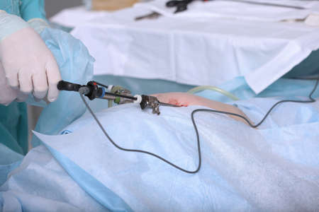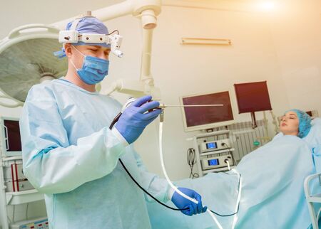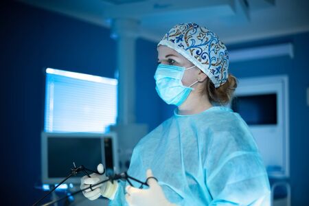 Surgeon woman doing surgical operation with laparoscopic instruments
