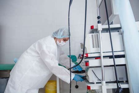 A young female endoscopist in a white protective suit, cap and gloves prepares the equipment for work.