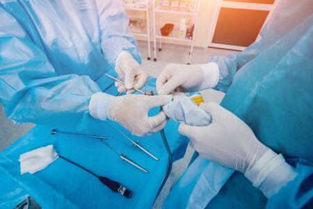 The surgeons hands are holding an operating tool in the operating room. Close-up, beautiful light, modern medicine, Saving lives.