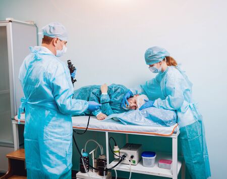 Team of doctors performing endoscopy in hospital examining stomach of patient