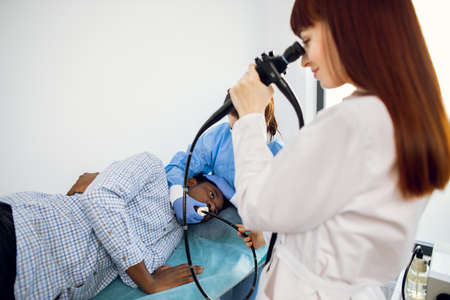 Close up of male Afro-American doctor with an endoscope and female colleague nurse examining young woman patient. Endoscopy, medical examination
