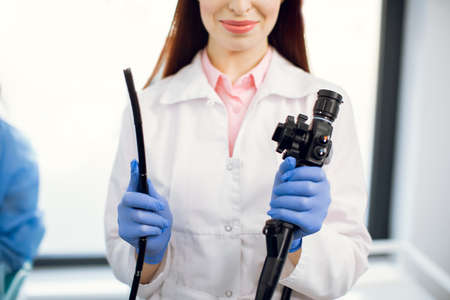 Gastrointestinal fiberoptic endoscopy concept. Cropped close up shot of female doctor holding modern endoscope device before gastroscopy examination
