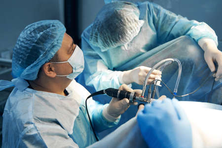 Arthroscope surgery. Orthopedic surgeons in teamwork in the operating room with modern arthroscopic tools. Knee surgery. Hospital background