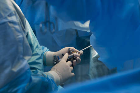 Selective focus on the hands of a surgeon with medical instruments during surgery. The doctor uses various laparoscopic instruments and manipulators during minimally invasive surgery.
