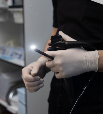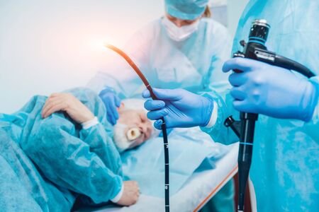 Endoscopy at the hospital. Doctor holding endoscope before gastroscopy. Medical examination