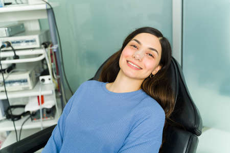 I feel very satisfied with my plastic surgery. Beautiful young woman with nose bandages smiling and making eye contact while sitting in the doctor's office for a check-up