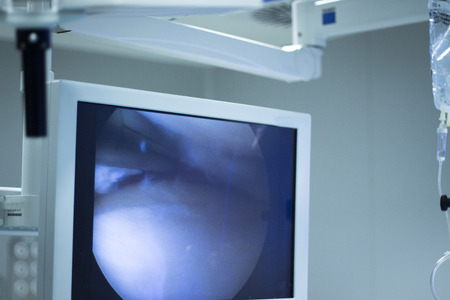 Hospital keyhole micro surgery arthroscopy operation screen showing arthroscope camera internal body image photo.