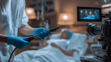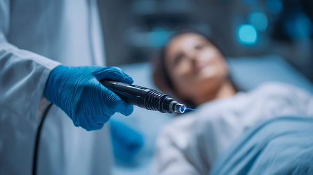 In the image, a medical professional is carrying out a gastroscopy using an endoscope and imaging tools to diagnose and treat a patients condition