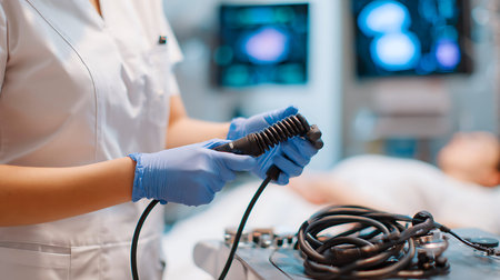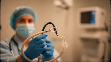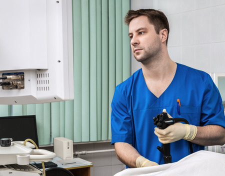 Male doctor holding endoscopic probe in gloved hands ready to start the diagnostic procedure to the patient.