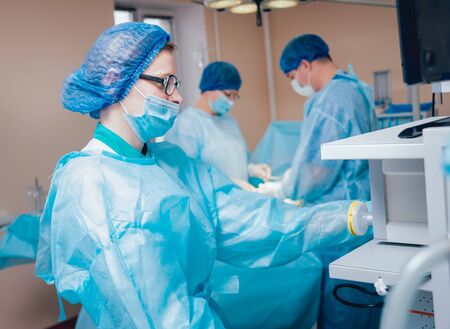 Process of gynecological surgery operation using laparoscopic equipment. Group of surgeons in operating room with surgery equipment. Background