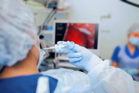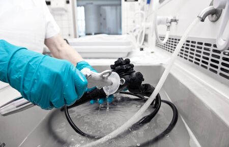 Selective focus on doctors hands holding an endoscope. Doctors hands in sterile gloves hold an endoscope for colonoscopy and early detection of cancerous tumors in the intestine.