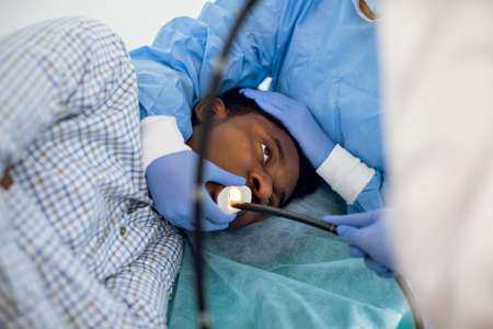 Close up cropped shot of young African American male patient, lying on the couch, having gastroscopic examination with endoscope in modern clinic.