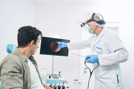 ENT doctor using fibrolaryngoscope to examine and treat the ears. ENT specialist diagnoses and treats larynx and pharynx, such as hoarseness, vocal cord nodules, tumors, infections, and inflammation