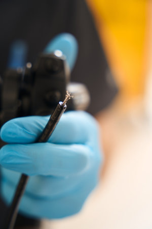 Closeup cosmetologist hands in latex gloves inserting needle into microblading device at beauty salon. Concept of cosmetology equipment for permanent makeup.