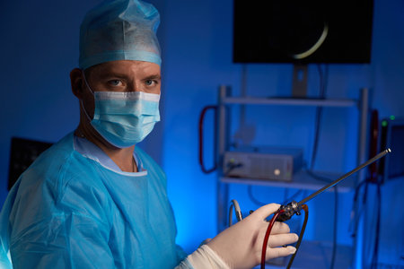 Male doctor with hysteroscope looking at camera before surgery in clinic