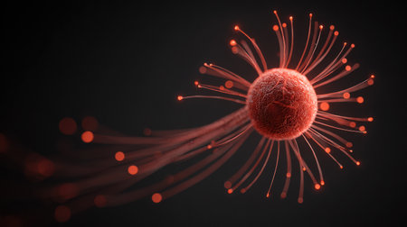 A vivid red cell with numerous long filaments extends outward against a dark backdrop, evoking a sense of movement and life in the microscopic world.