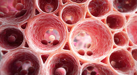 Digital rendering depicts cellular structures, tunnels, and spheres with red and pink hues