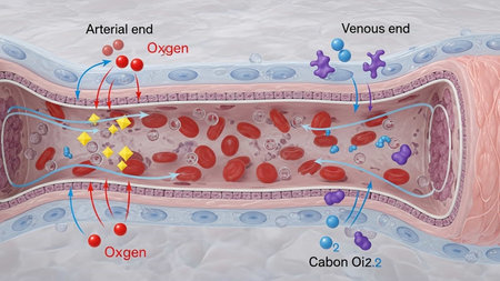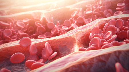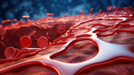 This image presents a detailed visualization of the interior of a blood vessel, showcasing flowing red blood cells and a glowing plasma environment, perfect for medical illustrations.