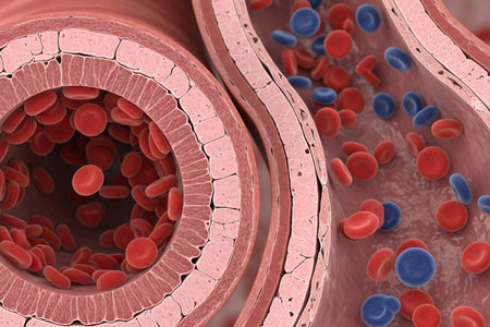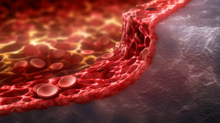Vessel blocked flow captured in a detailed vascular anatomy cross section illustrating constricted pathways and cellular movement helpful for clinical training and scientific presentations.