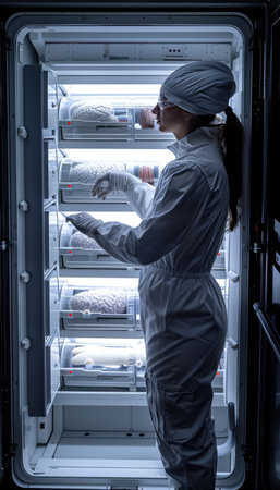 A scientist in protective gear examines cryogenic storage equipment while handling samples in a high tech laboratory environment.