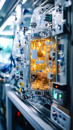 Cutting-edge bioreactor in a biotechnology lab, showcasing scientists examining the process of growing synthetic organs for medical transplants. Generative AI