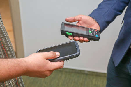 Secure payment technology concept and service charge, customers are using their phone to pay using paywave technology by tapping near the electronic card terminal.
