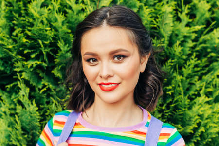 Outdoor portrait of happy young asian woman, posing outside, wearing colorful t-shirt