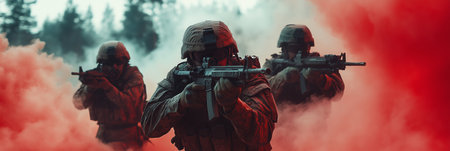 Three soldiers, clad in tactical gear and helmets, are depicted outdoors. The scene is bathed in warm, orange hues. The image shows the soldiers holding weapons, while a hazy background adds visual depth. Suitable for various editorial and commercial applications.