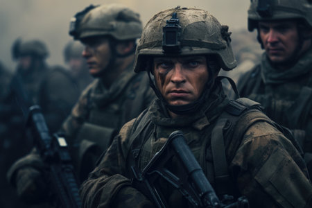 Captivating image of a soldier in combat gear showcasing focus and readiness, standing alongside team members in a military environment, symbolizing strength and teamwork.