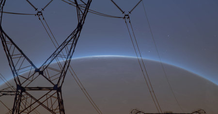 Image of data processing over pylons. global business, finances, connections and digital interface concept digitally generated image.