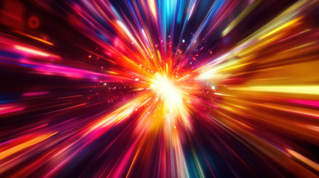 Bright showing explosive burst of colorful confetti and vibrant light beams emanating from a bright central point against a dark background keywords: explosive,...