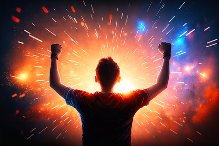 A jubilant young Black man with curly hair raises his arms in triumph against a backdrop of radiant yellow rays and colorful circles. This dynamic image captures the essence of joy and victory, inviting viewers to share in the exuberance of the moment.