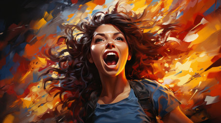 Woman with surprised look standing in front of colorful light burst. Generative AI.