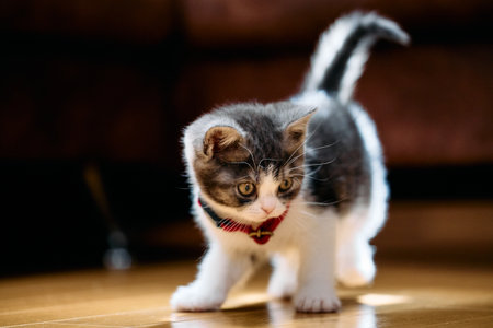 Very cute kitten is looking up with interest. Macro portrait of a cat indoor. Black and white photo