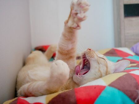 view top small newborn kitten with his tongue lying on his back on a white fluffy blanket. Pets and care domesticated animal.