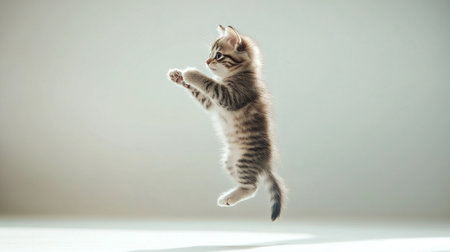 A kitten stretches its paw upward in a playful gesture against a dark background