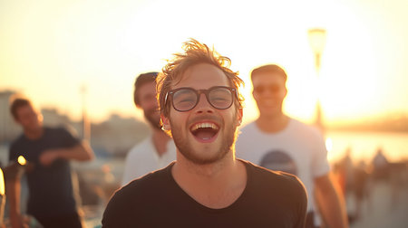 A man with glasses laughs heartily while walking with friends outdoors during a sunset. The image captures a moment of joy and camaraderie.