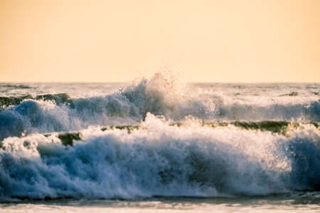 Waves breaking on the beach at sunset. Natural background with copy space