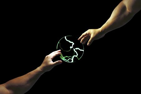 Plasma lamp on neutral background. Fingers of a man attracting the luminous electric flow. Crystal ball with electricity and light. Electricity made light.