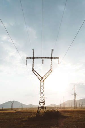 High-voltage power lines.Electricity pylon.Power Tower.Distribution electric substation with power lines and transformers.Electricity transmission power lines at sunset