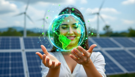 a stock photo of a woman creating renewable and sustainable eco energy, interacting with a 3d rendered electrical sphere. the sphere glows with green and blue energy patterns, hovering above her hands, set against a blurred background of solar panels and wind turbines, symbolizing environmental innovation