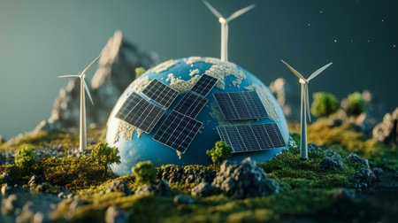 Abstract 3D globe with solar panels and wind turbines, symbolizing renewable energy