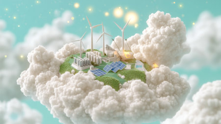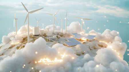 Renewable energy concept with wind turbines and solar panels on floating island, AI Generated