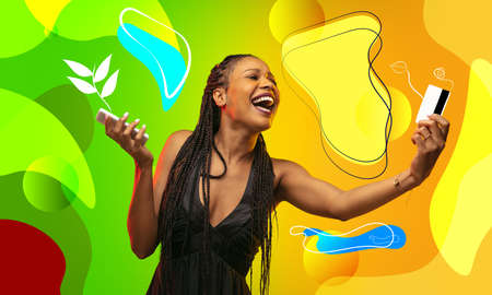 Smiling and showing card. African womans portrait. Pretty female model in casual. Concept of human emotions, facial expression, sales, copyspace. Bright, modern illustrated multicolored background.