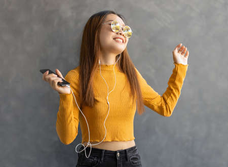 young smiling girl listens to music on headphones from her smartphone while dancing. Concept of serenity, lightheartedness and enjoyment