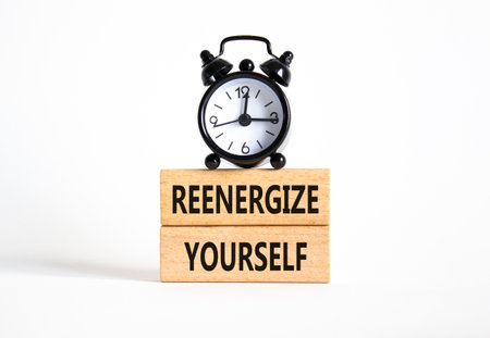 Reenergize yourself symbol. Concept words Reenergize yourself on wooden blocks. Beautiful white background with alarm clock. Mindfulness and Reenergize yourself concept. Copy space.