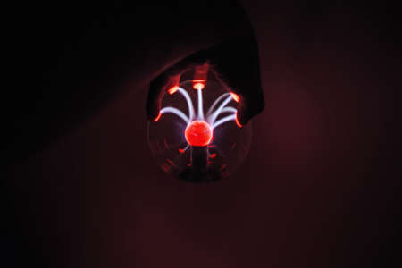 Decoration lamp in shape of plasma ball with red and blue electrodes over black background, close-up. Modern unusual types of illumination concept