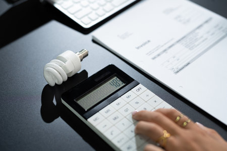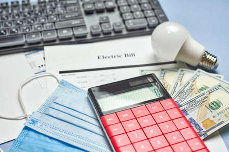 utility bill, calculator, money and lightbulb